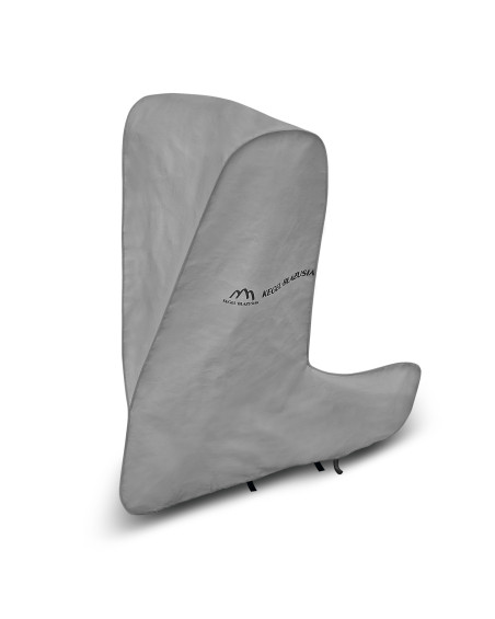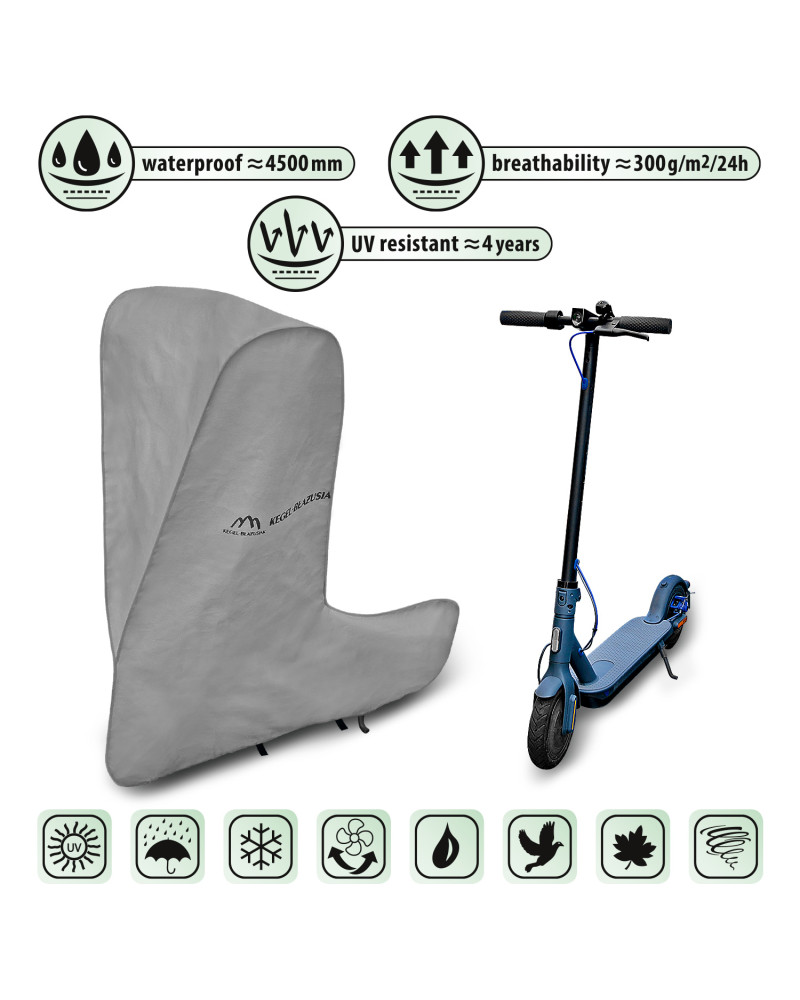 Wasserdichte und gleichzeitig dampfdurchlässige Membranabdeckung für einen Elektrotretroller zum Schutz vor ungünstigen Witterungsbedingungen. Wetterfeste Abdeckung, die vollständig aus einer hochgradig dampfdurchlässigen Membran besteht. Sie ist auch bei starkem Regen wasserdicht und zugleich dampfdurchlässig, so dass die Feuchtigkeit unter der Abdeckung nach außen geleitet wird. Sie verringert die Korrosion und Alterung von Kunststoffteilen und schützt vor Ausbleichen und Anlaufen von Lacken und Chromteilen. Sie eignet sich für die kurzfristige Aufbewahrung eines Elektrotretrollers im Freien. Sie wird mit einem Gummizug befestigt, so dass sie leicht auf- und abgezogen werden kann. Zusätzliche Verschlüsse unter dem Tretroller verhindern, dass die Abdeckung durch den Wind abgerissen wird. Sie ist auch für die Verwendung in Innenräumen geeignet.