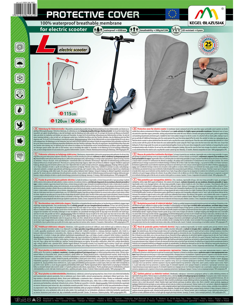 Die Abdeckung ist mit der bedruckten Seite nach außen auf einen sauberen und trockenen Roller bei ausgeschaltetem Strom aufzuziehen und dann mit den an der unteren Innenseite der Abdeckung eingenähten Klettbändern unter dem Roller zu befestigen. Man sollte sich vergewissern, dass beide Klettverschluss-Paare unter dem Roller sicher befestigt sind. Die Abdeckung darf nicht während des Aufladens der Rollerbatterie und der Rollerbeförderung auf offenen äußeren Gepäckträgern von Fahrzeugen genutzt werden. Man sollte sie nicht benutzen, wenn sie beschädigt oder undicht ist. Die Abdeckung ist nur für die gelegentliche Aufbewahrung des Elektrorollers auf überdachten Balkonen und unter Unterständen gedacht.