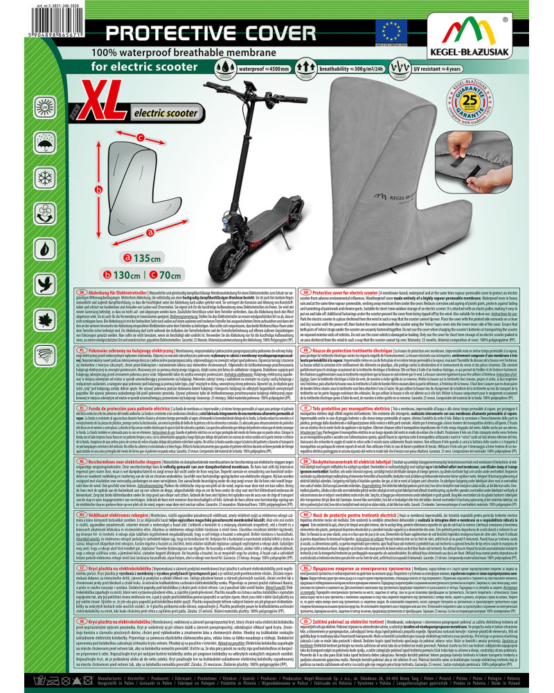 Die Abdeckung ist mit der bedruckten Seite nach außen auf einen sauberen und trockenen Roller bei ausgeschaltetem Strom aufzuziehen und dann mit den an der unteren Innenseite der Abdeckung eingenähten Klettbändern unter dem Roller zu befestigen. Man sollte sich vergewissern, dass beide Klettverschluss-Paare unter dem Roller sicher befestigt sind. Die Abdeckung darf nicht während des Aufladens der Rollerbatterie und der Rollerbeförderung auf offenen äußeren Gepäckträgern von Fahrzeugen genutzt werden. Man sollte sie nicht benutzen, wenn sie beschädigt oder undicht ist. Die Abdeckung ist nur für die gelegentliche Aufbewahrung des Elektrorollers auf überdachten Balkonen und unter Unterständen gedacht.