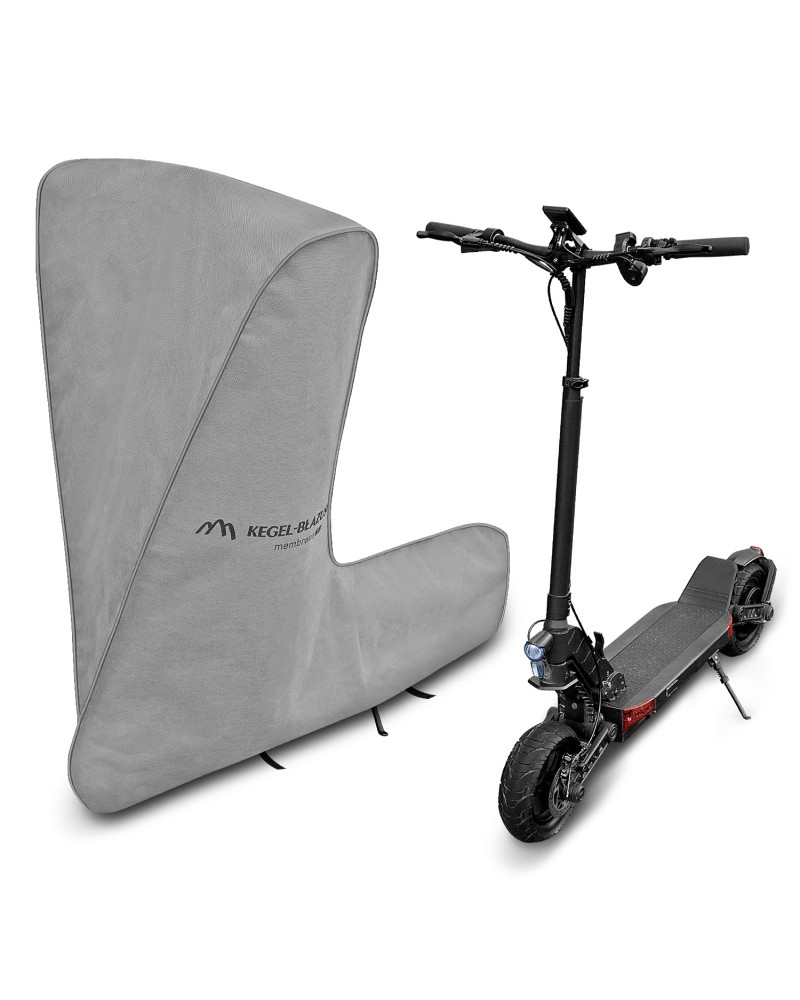 Wasserdichte und gleichzeitig dampfdurchlässige Membranabdeckung für einen Elektrotretroller zum Schutz vor ungünstigen Witterungsbedingungen. Wetterfeste Abdeckung, die vollständig aus einer hochgradig dampfdurchlässigen Membran besteht. Sie ist auch bei starkem Regen wasserdicht und zugleich dampfdurchlässig, so dass die Feuchtigkeit unter der Abdeckung nach außen geleitet wird. Sie verringert die Korrosion und Alterung von Kunststoffteilen und schützt vor Ausbleichen und Anlaufen von Lacken und Chromteilen. Sie eignet sich für die kurzfristige Aufbewahrung eines Elektrotretrollers im Freien. Sie wird mit einem Gummizug befestigt, so dass sie leicht auf- und abgezogen werden kann. Zusätzliche Verschlüsse unter dem Tretroller verhindern, dass die Abdeckung durch den Wind abgerissen wird. Sie ist auch für die Verwendung in Innenräumen geeignet.