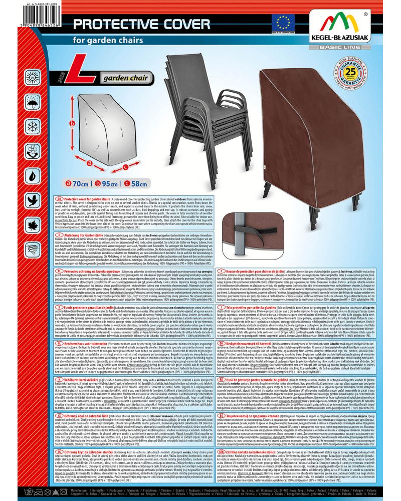 Ganzjahresabdeckung zum Schutz von im Freien gelagerten Gartenstühlen vor widrigen Umwelteinflüssen. Die Abdeckung ist für einen oder mehrere gestapelte Stühle ausgelegt. Dank ihrer speziellen Konstruktion läuft das Wasser bei Regen von der Abdeckung ab, ohne unter die Abdeckung zu dringen, und der Wasserdampf wird nach außen abgeleitet. Sie schützt die Stühle vor Regen, Schnee, Frost und Sonnenlicht (schädlicher UV-Strahlung) sowie Verunreinigungen wie Staub, Vogelkot und Baumsäfte. Sie verringert die Korrosion und Alterung von Kunststoff- und Holzteilen und schützt vor Ausbleichen und Anlaufen von Lacken und Chromteilen. Die Abdeckung hält allen Witterungsbedingungen stand. Leicht an- und auszuziehen. Die zusätzlichen Verschlüsse schützen die Abdeckung vor dem Abreißen durch den Wind. Sie ist auch für die Verwendung in Innenräumen geeignet.