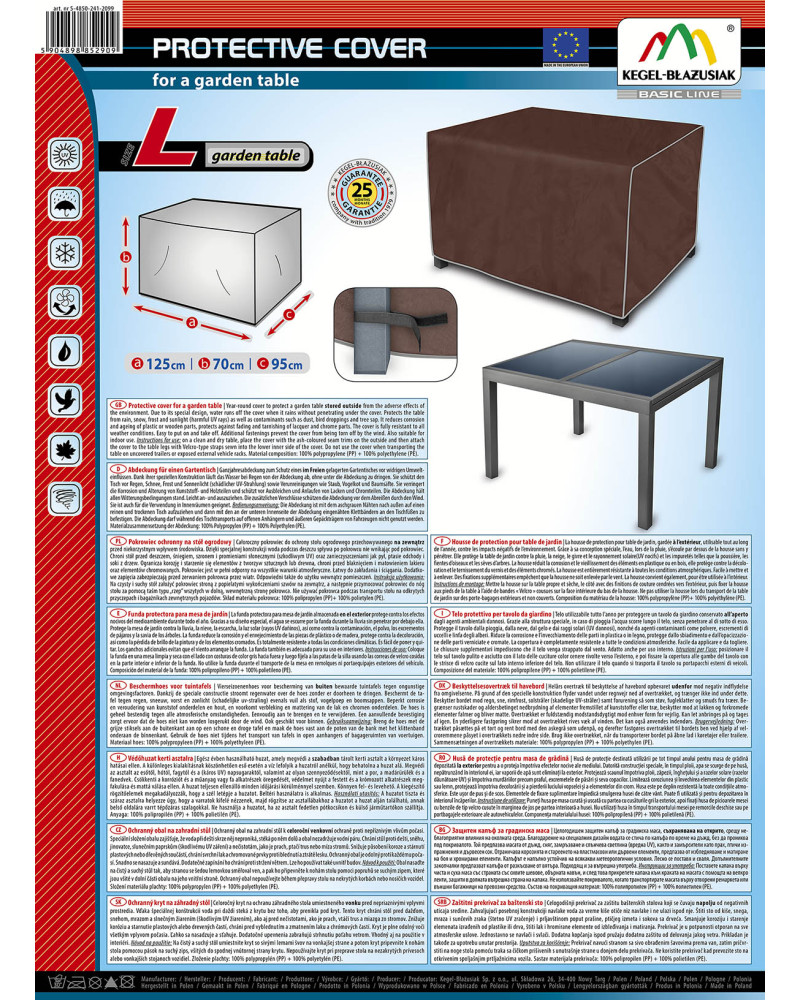 Ganzjahresabdeckung zum Schutz eines im Freien gelagerten Gartentisches vor widrigen Umwelteinflüssen. Dank ihrer speziellen Konstruktion läuft das Wasser bei Regen von der Abdeckung ab, ohne unter die Abdeckung zu dringen. Sie schützt den Tisch vor Regen, Schnee, Frost und Sonnenlicht (schädlicher UV-Strahlung) sowie Verunreinigungen wie Staub, Vogelkot und Baumsäfte. Sie verringert die Korrosion und Alterung von Kunststoff- und Holzteilen und schützt vor Ausbleichen und Anlaufen von Lacken und Chromteilen. Die Abdeckung hält allen Witterungsbedingungen stand. Leicht an- und auszuziehen. Die zusätzlichen Verschlüsse schützen die Abdeckung vor dem Abreißen durch den Wind. Sie ist auch für die Verwendung in Innenräumen geeignet.