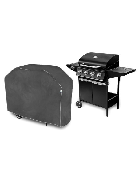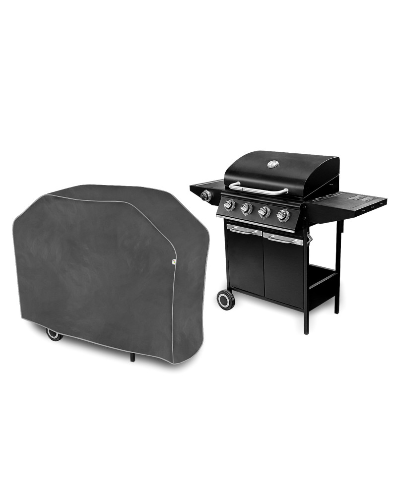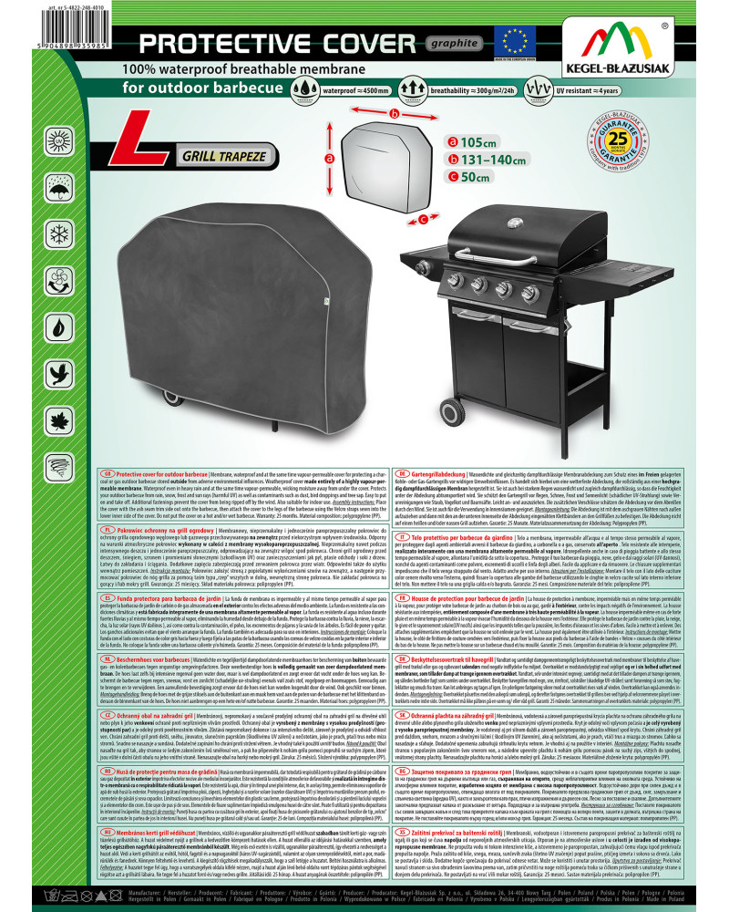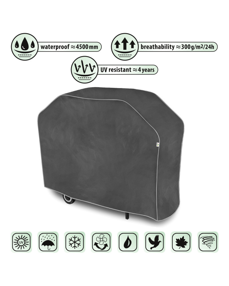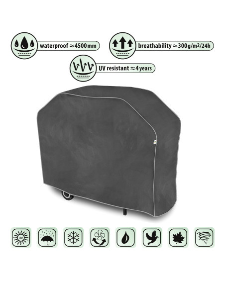 Wasserdichte und gleichzeitig dampfdurchlässige Membranabdeckung zum Schutz eines im Freien gelagerten Kohle- oder Gas-Gartengrills vor widrigen Umwelteinflüssen. Es handelt sich hierbei um eine wetterfeste Abdeckung, die vollständig aus einer hochgradig dampfdurchlässigen Membran hergestellt ist. Sie ist auch bei starkem Regen wasserdicht und zugleich dampfdurchlässig, so dass die Feuchtigkeit unter der Abdeckung abtransportiert wird. Sie schützt den Gartengrill vor Regen, Schnee, Frost und Sonnenlicht (schädlicher UV-Strahlung) sowie Verunreinigungen wie Staub, Vogelkot und Baumsäfte. Leicht an- und auszuziehen. Die zusätzlichen Verschlüsse schützen die Abdeckung vor dem Abreißen durch den Wind. Sie ist auch für die Verwendung in Innenräumen geeignet.