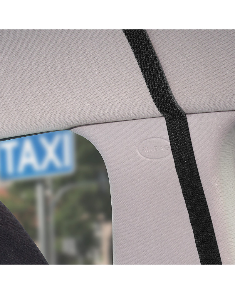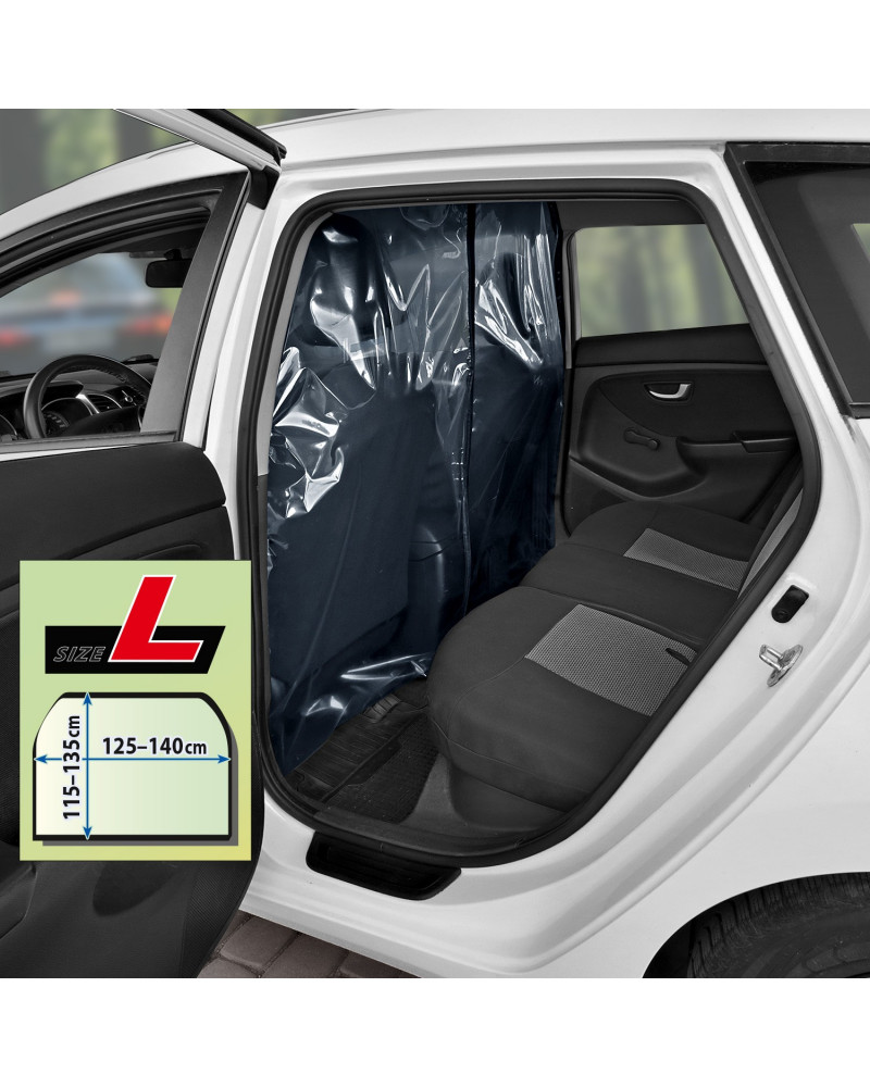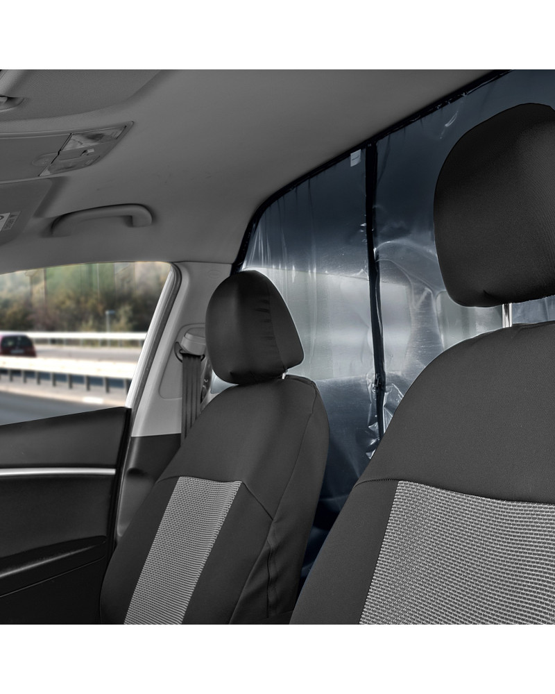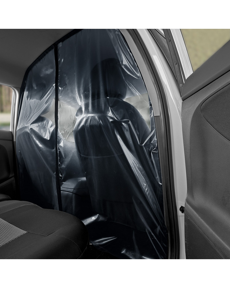Transparenter Vorhang, der den Fahrerraum (zwei Vordersitze) vom Fahrgastraum (hintere Sitzbank) trennt. Mit einer fahrerseitig zu öffnenden und einstellbaren Öffnung, die die Zahlungsentgegennahme ermöglicht. Durch denVorhang können kontaktlose Zahlungen mit der Karte vorgenommen werden, ohne dass man diesen aufknöpfen muss. Bei korrekter Montage bildet der Vorhang eine hochdichte Barriere imWagen. Der Vorhang kann mit handelsüblichen Desinfektionsmitteln desinfiziert und mit handelsüblichen Reinigungsmitteln gereinigt werden. Einfache Montage ohne Werkzeugeinsatz mittels eines selbstklebenden Industrieklettbandes und eines robusten selbstklebenden Klettbandes.