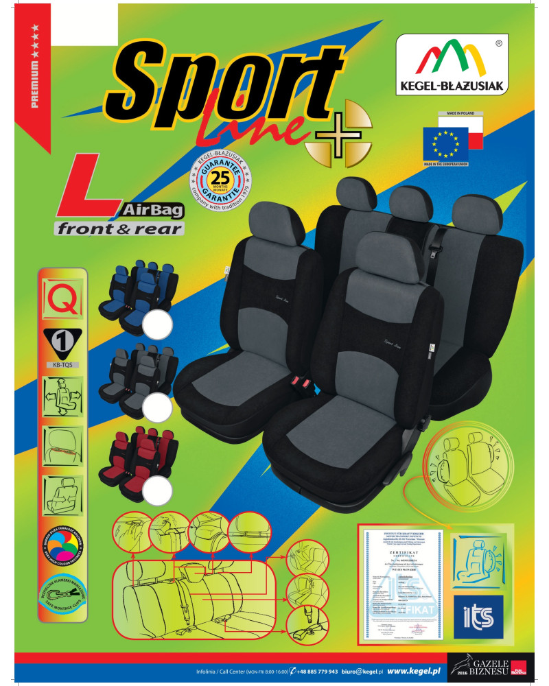 Eleganz und sportliche Optik sind die beiden Hauptmerkmale, die die universellen, passgenauen Bezüge der SPORT LINE auszeichnen. Sie sind in drei Farbvarianten - Blau, Rot und Graphit - in intensiven und doch gedeckten Farbtönen erhältlich. Die Bezüge verfügen über spezielle Sicherheitsnähte für Airbags und sind somit sowohl für Autositze mit Seitenairbags als auch für Standardautositze geeignet. Die Betriebssicherheit belegen ein Zertifikat und die Prüfberichte des Instytut Transportu Samochodowego (poln. Instituts für Kraftverkehr).