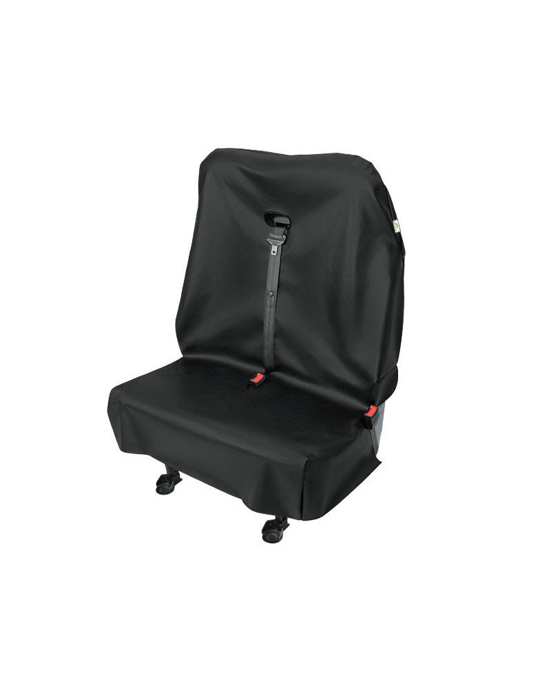 Wasserdichter, für Sicherheitsgurte geeigneter Schonbezug zur Beförderung von Passagieren oder Gepäck auf einem Doppelsitz eines Lieferwagens. Der Doppelsitz wird vor Verschmutzung und Beschädigung effektiv geschützt. Durch verschließbare Öffnungen können die Sicherheitsgurte von beiden Passagieren verwendet werden. Aus einem strapazierfähigen und hautfreundlichen Kunstleder. Sehr leicht zu reinigen.