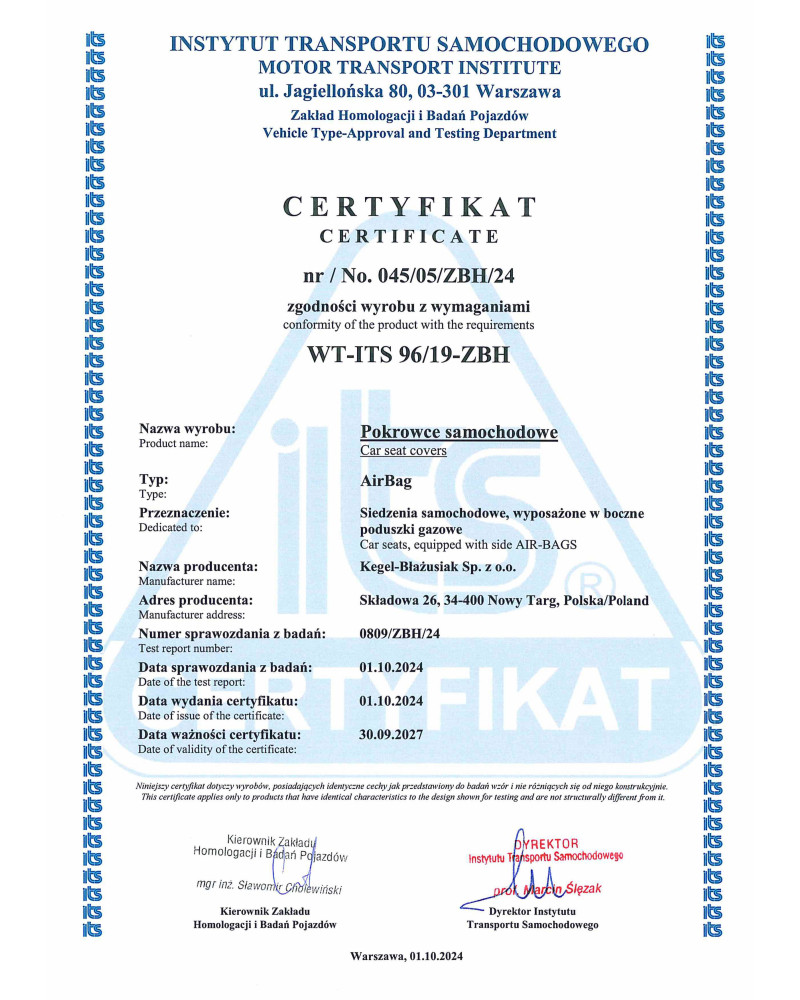 Die Betriebssicherheit unserer Bezüge belegen ein Zertifikat und die Prüfberichte des Instytut Transportu Samochodowego (poln. Instituts für Kraftverkehr)