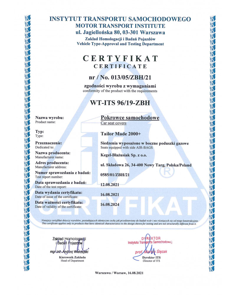 Die Betriebssicherheit unserer Bezüge belegen ein Zertifikat und die Prüfberichte des Instytut Transportu Samochodowego (poln. Instituts für Kraftverkehr)
