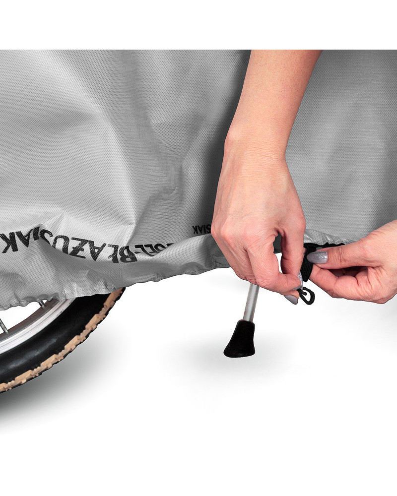 Die Abdeckung auf die abgebildete Weise auf saubere Fahrräder aufziehen. Den mitgelieferten Haken verwenden, um die Befestigungsschlaufen der Abdeckung unter den Fahrradrahmen zu klemmen