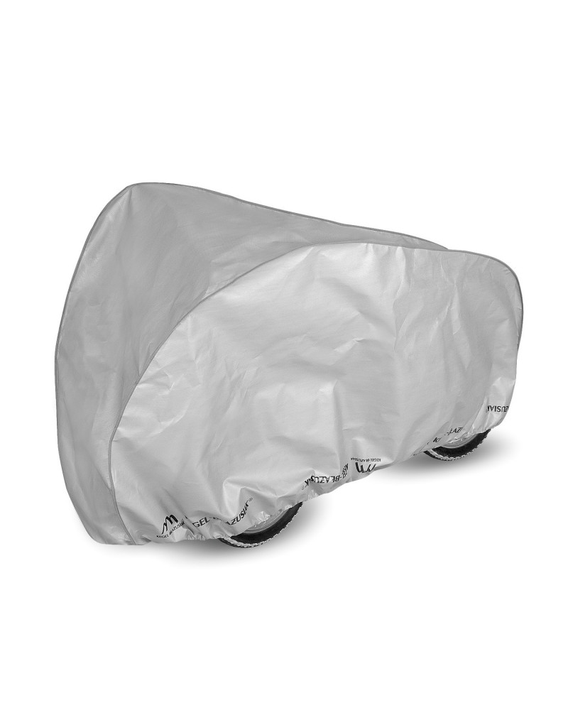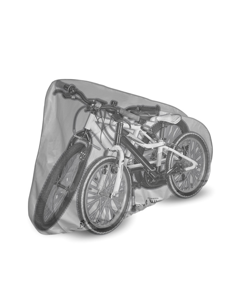 Ganzjährige, wasserdichte Schutzabdeckung für zwei nebeneinander gestellte Fahrräder. Die Abdeckung schützt die Fahrräder vor widrigen Umwelteinflüssen. Sie ist wasserdicht, wodurch die Fahrräder vor Regen oder Schnee geschützt sind. Die unter der Abdeckung angesammelte Feuchtigkeit wird nach außen abgeleitet. Die Abdeckung schränkt Korrosion ein und schützt den Lack und verchromte Elemente vor dem Verblassen und Ermatten. Sie schützt vor jeglichen Niederschlägen, Sonne (UV-Strahlen), Staub, Vogelkot, Baumsäften und Frost. Sie friert nicht an. Sie ist beständig gegen Sonnenlicht sowie hohe als auch niedrige Temperaturen. Die Abdeckung wird mit einem Gummizug befestigt, so dass sie leicht auf die Fahrräder auf- und von diesen abgezogen werden kann. Ein zusätzlicher Verschluss schützt die Abdeckung vor dem Abreißen durch den Wind.