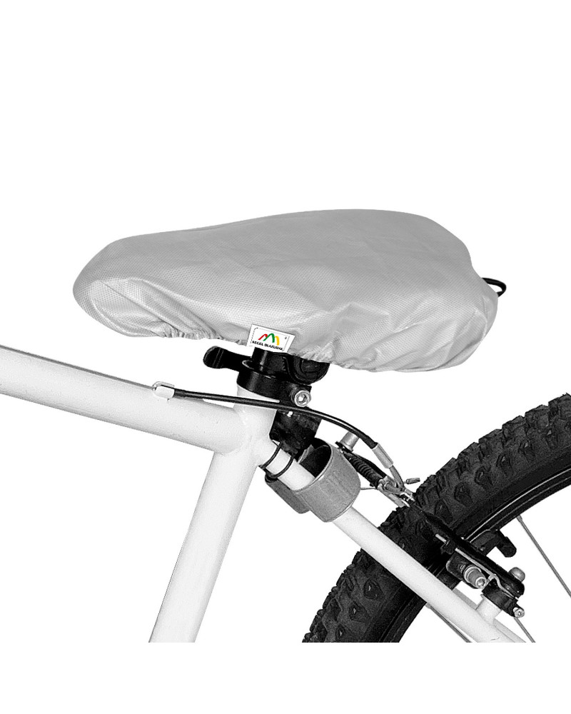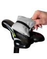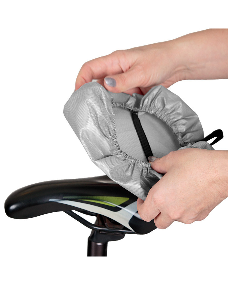 Haltbarer und wasserdichter Bezug für einen Fahrradsattel zum Schutz vor Niederschlägen und der zerstörerischen Sonneneinwirkung (UV-Strahlung). Montageanleitung: Den Bezug auf die abgebildete Weise auf einen sauberen Sattel aufziehen. Nach dem Abziehen kann der gefaltete Bezug mit der eingenähten Schlaufe befestigt werden.