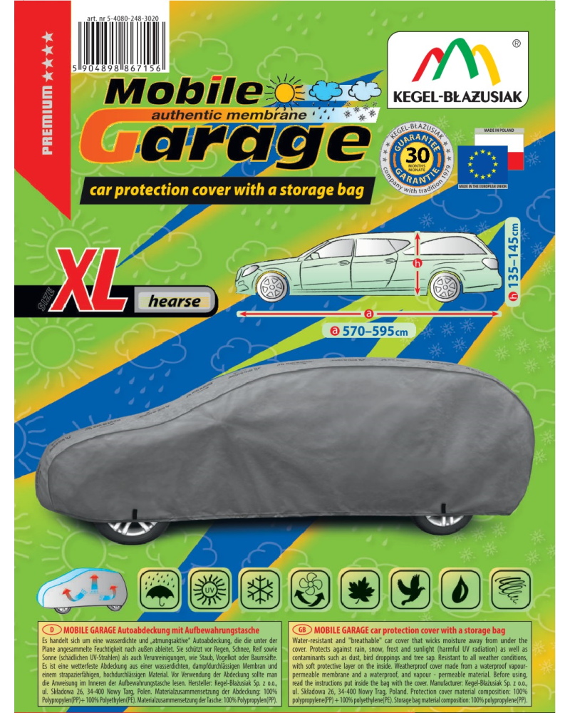 Wasserdichter Schonbezug für das ganze Kraftfahrzeug, der die Feuchtigkeit unter dem Schonbezug abführt. Er schützt das Kraftfahrzeug ganzjährig vor schädlichen Umwelteinflüssen. Der Schonbezug ist für die Fahrzeugmodelle geeignet, die in der oben genannten Tabelle aufgeführt wurden. Er ist leicht aufzubringen und abzunehmen. Dank einer speziellen Struktur und Anfertigung aus dreischichtiger wasserdichter dampfdurchlässiger Membran und schwer wasserdurchlässigem dampfdurchlässigem Material ist der Schonbezug im Regen fast vollständig dicht, und führt zugleich bei positiver Umgebungstemperatur die unter dem Schonbezug angesammelte Feuchtigkeit nach außen ab.
