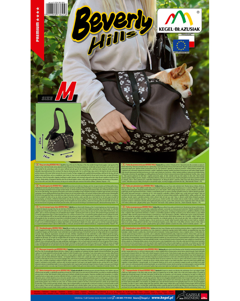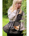 Größe M für einen Hund von der Größe eines Chihuahuas oder Yorks. Sie eignet sich jedoch auch für Welpen größerer Rassen. Tragfähigkeit der Tasche bis zu 8 kg. Mit einer Minileine im Inneren der Tasche und mit einer verstellbaren Reißverschlussklappe zur Sicherung des Hundes gegen Herausspringen.