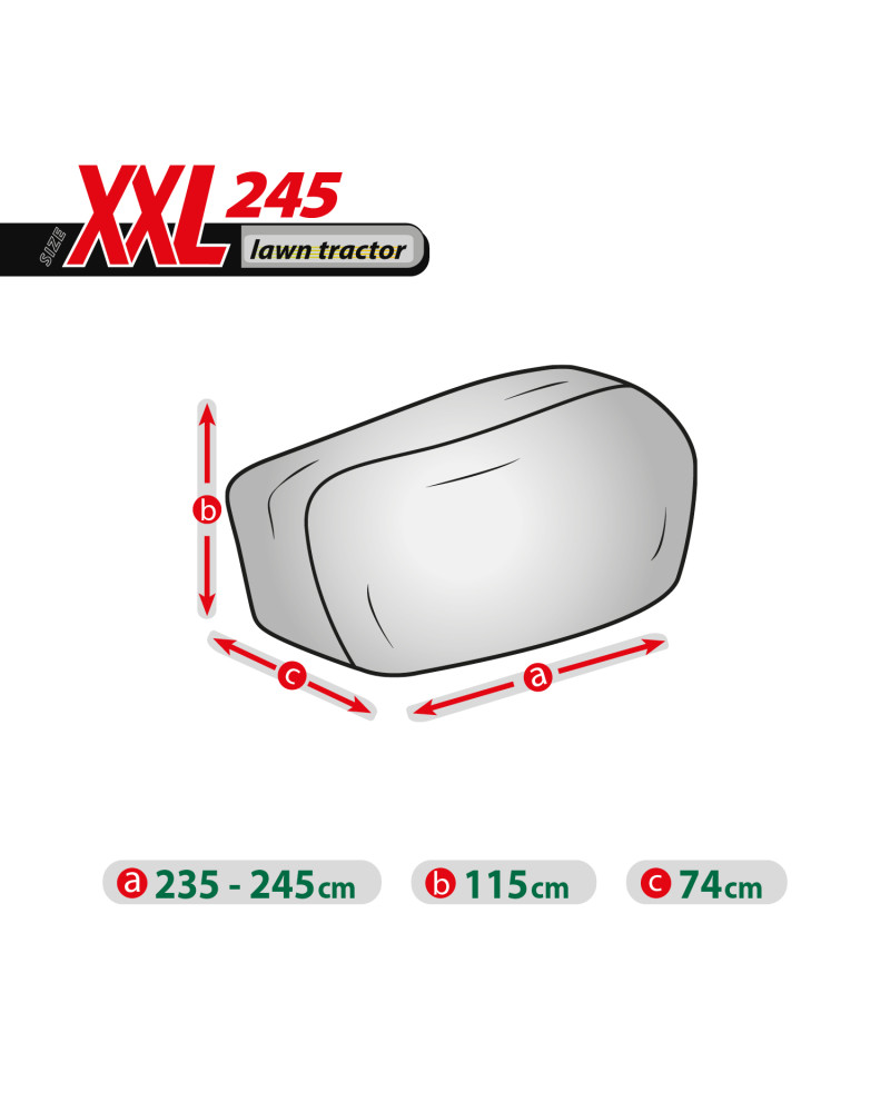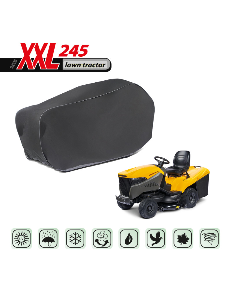 Ganzjahresabdeckung zum Schutz eines im Freien gelagerten Rasentraktors vor widrigen Umwelteinflüssen. Dank ihrer speziellen Konstruktion läuft das Wasser bei Regen von der Abdeckung ab, ohne unter die Abdeckung zu dringen, und der Wasserdampf wird nach außen abgeleitet. Sie schützt den Rasentraktor vor Regen, Schnee, Frost und Sonnenlicht (schädlicher UV-Strahlung) sowie Verunreinigungen wie Staub, Vogelkot und Baumsäfte. Sie verringert die Korrosion und Alterung von Kunststoffteilen und schützt vor Ausbleichen und Anlaufen von Lacken und Chromteilen. Die Abdeckung hält allen Witterungsbedingungen stand.