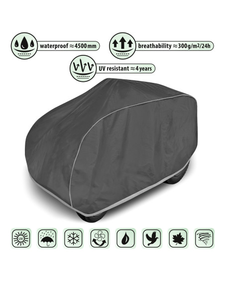 Wasserdichte und gleichzeitig dampfdurchlässige Membranabdeckung zum Schutz eines im Freien gelagerten Rasentraktors vor widrigen Umwelteinflüssen. Es handelt sich hierbei um eine wetterfeste Abdeckung, die vollständig aus einer hochgradig dampfdurchlässigen Membran hergestellt ist. Sie ist auch bei starkem Regen wasserdicht und zugleich dampfdurchlässig, so dass die Feuchtigkeit unter der Abdeckung abtransportiert wird. Sie schützt den Rasentraktor vor Regen, Schnee, Frost und Sonnenlicht (schädlicher UV-Strahlung) sowie Verunreinigungen wie Staub, Vogelkot und Baumsäfte. Sie verringert die Korrosion und Alterung von Kunststoffteilen und schützt vor Ausbleichen und Anlaufen von Lacken und Chromteilen.
