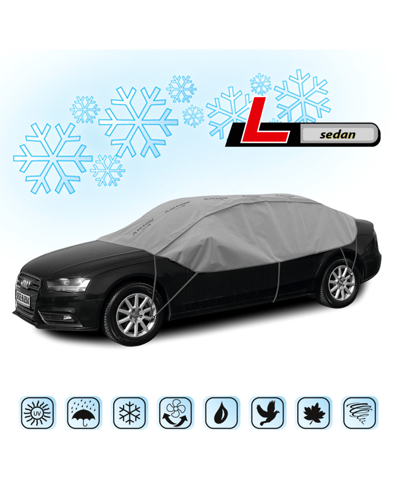 Schutzhülle für den Ganzjahresgebrauch. Im Winter schützt die Schutzhülle die Scheiben und Spiegel eines draußen geparkten Wagens vor Frost und Schnee. Sie deckt die Klinken und Wagenschlösser ab und schützt diese vor dem Gefrieren. Außerdem schützt die Schutzhülle die Scheiben und das Wagendach das ganze Jahr über vor Baumsäften, Vogelexkrementen und Staubablagerungen. Die Schutzhülle ist schwer wasserdurchlässig und schwer dampfdurchlässig.