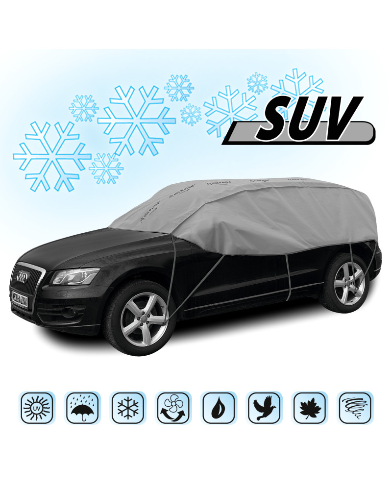 Schutzhülle für den Ganzjahresgebrauch. Im Winter schützt die Schutzhülle die Scheiben und Spiegel eines draußen geparkten Wagens vor Frost und Schnee. Sie deckt die Klinken und Wagenschlösser ab und schützt diese vor dem Gefrieren. Außerdem schützt die Schutzhülle die Scheiben und das Wagendach das ganze Jahr über vor Baumsäften, Vogelexkrementen und Staubablagerungen. Die Schutzhülle ist schwer wasserdurchlässig und schwer dampfdurchlässig.