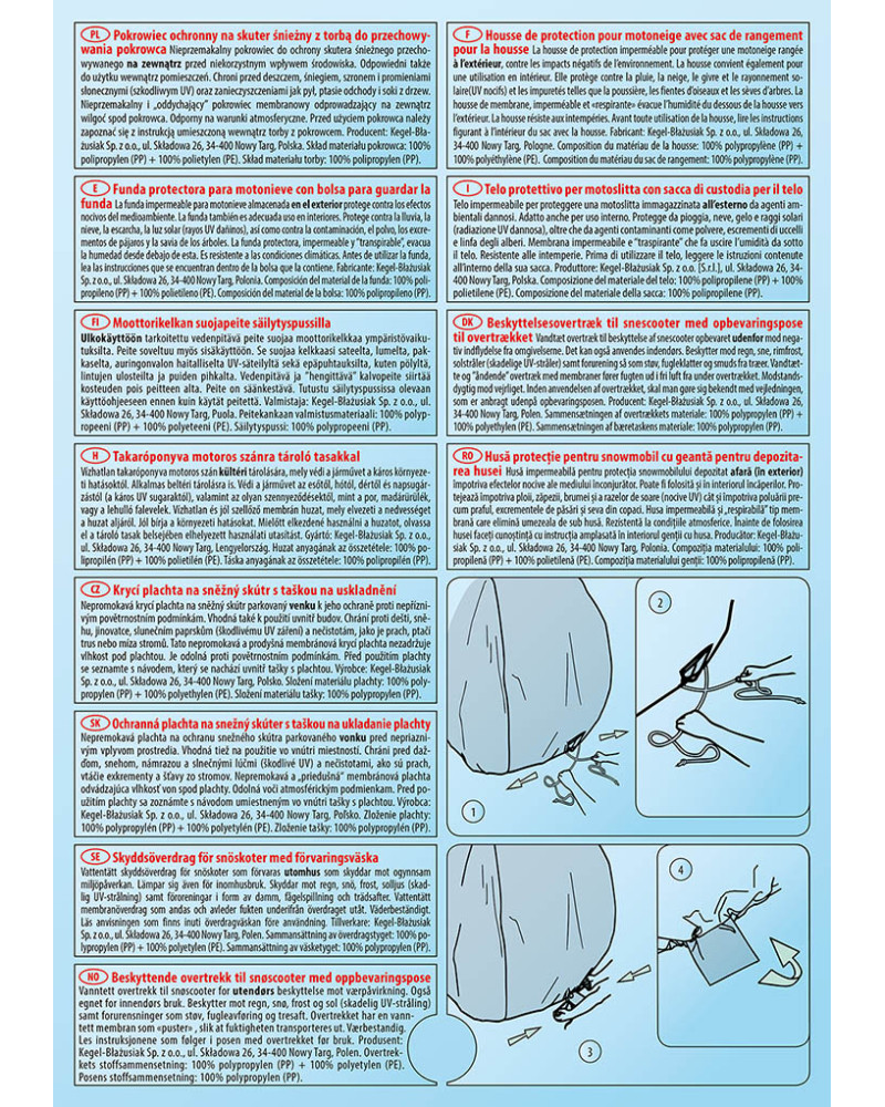 Wasserdichte Abdeckung zum Schutz eines im Freien gelagerten Schneescooters vor widrigen Umwelteinflüssen. Auch für die Verwendung in Innenräumen geeignet. Sie schützt vor Regen, Schnee, Frost und Sonnenlicht (schädlicher UV-Strahlung) sowie Verunreinigungen wie Staub, Vogelkot und Baumsäfte. Die wasserdichte und atmungsaktive Membranabdeckung leitet die Feuchtigkeit unter der Abdeckung nach außen. Sie ist wetterbeständig. Vor der Abdeckungsnutzung sollte man sich mit der Anleitung im Inneren der Aufbewahrungstasche vertraut machen.