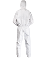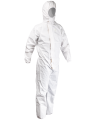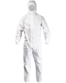 Der aus Vlies und einer Polypropylenmembran gefertigte Overall bedeckt den Träger von Kopf bis Fuß, um Spritzer und Verschmutzungen zu vermeiden. Die umfassende Overallstruktur und die Anwendung wasserfesten und dampfdurchlässigen Materials sorgen für Sicherheit und große Bewegungsfreiheit. Das Ganze wird von einer Kapuze, einer den Verschluss abdeckenden Falte mit einem Klettverschluss und Hosenbeinen und Ärmeln mit Gummibund ergänzt.