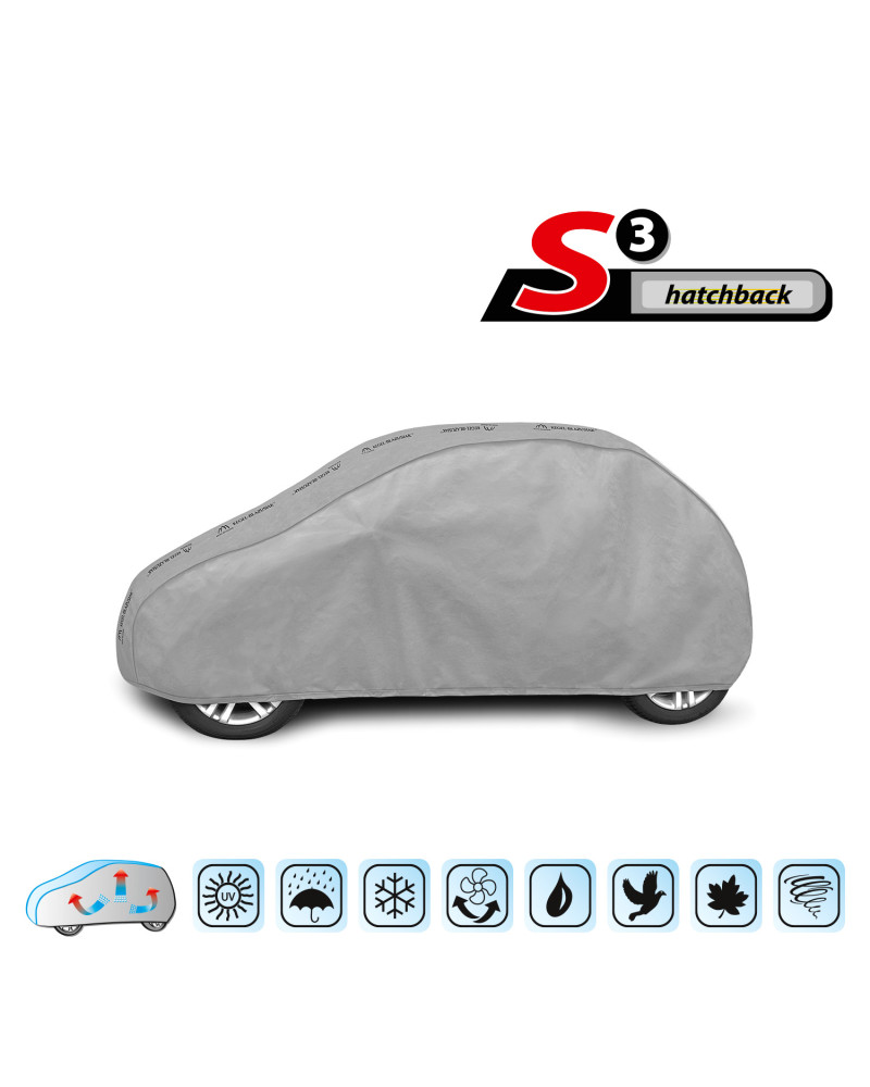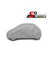 Ganzjährige, wasserdichte Autoschutzabdeckung BASIC GARAGE, die die sich unter der Abdeckung ansammelnde Feuchte nach außen leitet. Sie ist für den ganzjährigen Schutz eines geparkten Wagens vor ungünstigen Witterungsbedingungen konzipiert. Dank der Verwendung von zwei Stoffarten bleibt die Abdeckung auch bei intensiven Regenschauern fast komplett dicht und leitet die sich unter der Abdeckung sammelnde Feuchte nach außen ab. Der obere Abdeckungsteil ist aus einem einschichtigen wasserdichten Material gefertigt. Die Seitenflanken sind aus einem schwer dampfdurchlässigen Material gefertigt.