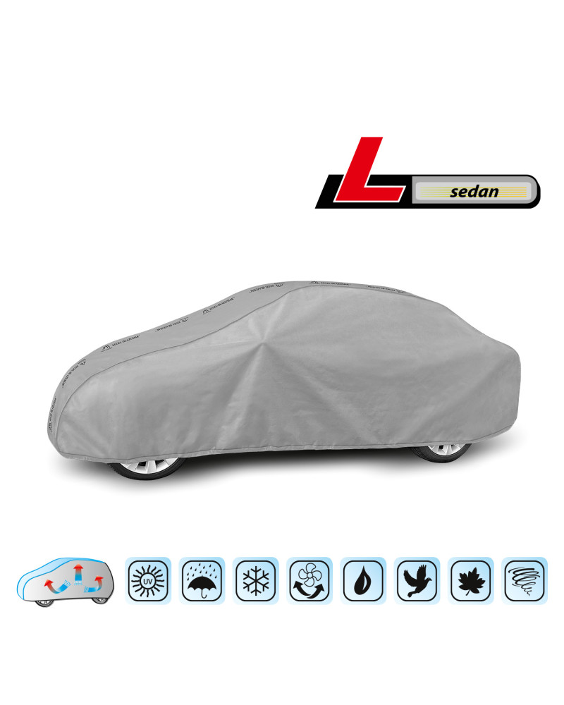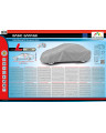 Ganzjährige, wasserdichte Autoschutzabdeckung BASIC GARAGE, die die sich unter der Abdeckung ansammelnde Feuchte nach außen leitet. Sie ist für den ganzjährigen Schutz eines geparkten Wagens vor ungünstigen Witterungsbedingungen konzipiert. Dank der Verwendung von zwei Stoffarten bleibt die Abdeckung auch bei intensiven Regenschauern fast komplett dicht und leitet die sich unter der Abdeckung sammelnde Feuchte nach außen ab. Der obere Abdeckungsteil ist aus einem einschichtigen wasserdichten Material gefertigt. Die Seitenflanken sind aus einem schwer dampfdurchlässigen Material gefertigt.