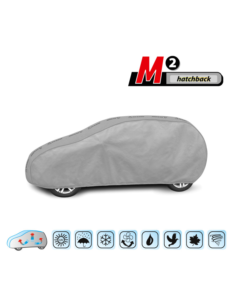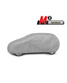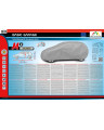 Ganzjährige, wasserdichte Autoschutzabdeckung BASIC GARAGE, die die sich unter der Abdeckung ansammelnde Feuchte nach außen leitet. Sie ist für den ganzjährigen Schutz eines geparkten Wagens vor ungünstigen Witterungsbedingungen konzipiert. Dank der Verwendung von zwei Stoffarten bleibt die Abdeckung auch bei intensiven Regenschauern fast komplett dicht und leitet die sich unter der Abdeckung sammelnde Feuchte nach außen ab. Der obere Abdeckungsteil ist aus einem einschichtigen wasserdichten Material gefertigt. Die Seitenflanken sind aus einem schwer dampfdurchlässigen Material gefertigt.