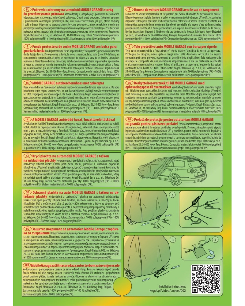 Wasserdichter Schonbezug für das ganze Kraftfahrzeug, der die Feuchtigkeit unter dem Schonbezug abführt. Er schützt das Kraftfahrzeug ganzjährig vor schädlichen Umwelteinflüssen. Der Schonbezug ist für die Fahrzeugmodelle geeignet, die in der oben genannten Tabelle aufgeführt wurden. Er ist leicht aufzubringen und abzunehmen. Dank einer speziellen Struktur und Anfertigung aus dreischichtiger wasserdichter dampfdurchlässiger Membran und schwer wasserdurchlässigem dampfdurchlässigem Material ist der Schonbezug im Regen fast vollständig dicht, und führt zugleich bei positiver Umgebungstemperatur die unter dem Schonbezug angesammelte Feuchtigkeit nach außen ab.