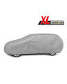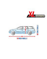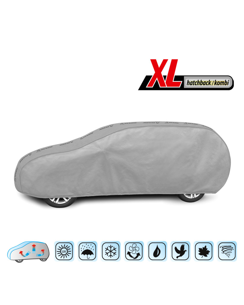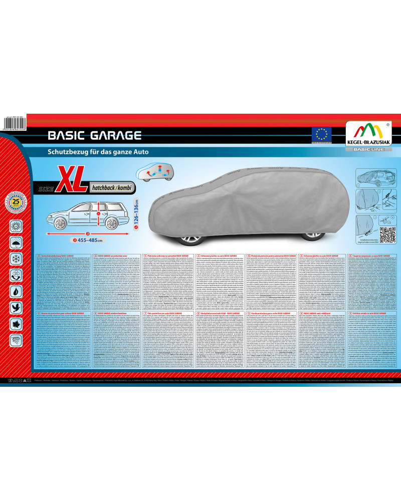 Ganzjährige, wasserdichte Autoschutzabdeckung BASIC GARAGE, die die sich unter der Abdeckung ansammelnde Feuchte nach außen leitet. Sie ist für den ganzjährigen Schutz eines geparkten Wagens vor ungünstigen Witterungsbedingungen konzipiert. Dank der Verwendung von zwei Stoffarten bleibt die Abdeckung auch bei intensiven Regenschauern fast komplett dicht und leitet die sich unter der Abdeckung sammelnde Feuchte nach außen ab. Der obere Abdeckungsteil ist aus einem einschichtigen wasserdichten Material gefertigt. Die Seitenflanken sind aus einem schwer dampfdurchlässigen Material gefertigt.