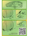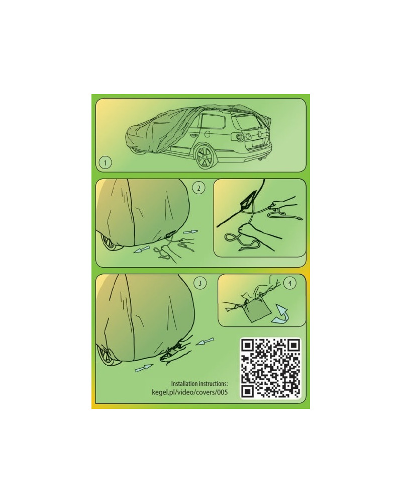 Die Abdeckung ist auf ein reines Fahrzeug mit der Aufdruckseite nach außen aufzuziehen. Danach hat man die Bundleine fest zusammenzuziehen und sie zuzubinden. Eine von innen verschmutzte Hülle darf nicht verwendet werden. Die Abdeckung ist nur für die Nutzung mit einem geparkten Wagen bestimmt. Sie darf nicht beim Transport des Fahrzeugs auf einem Autotransportanhänger verwendet werden.