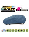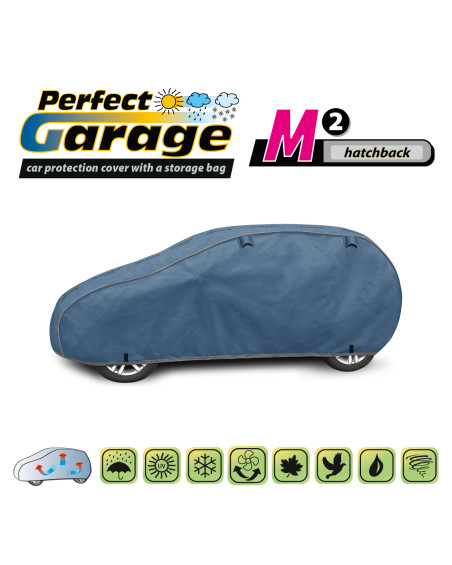 Ganzjährige Membranschutzplane für das Auto mit weichem Innenfutter und witterungsbeständiger Oberfläche. Vollständig aus vierschichtigem Material mit wasserabweisender, dampfdurchlässiger Membran gefertigt. Dadurch ist die Plane komplett wasserdicht, leitet aber den Wasserdampf von innen ab. Ein mit der Perfect Garage abgedeckter PKW bleibt bei Regen trocken, wobei der Wasserdampf durch die Membran verdampft und das Fahrzeug so gegen Korrosion geschützt wird. Darüber hinaus schützt die Stoffgarage gegen Rostflecken, Ausbleichen und Glanzverlust von Lack und Chromteilen. Schützt zudem gegen Regen (auch sauren Regen), Sonne (UV-Strahlung), Staub, Vogelausscheidungen, Blätter, Baumharz, Schnee und Rauhreif. Die weiche Polsterung der Plane verhindert die meisten Kratzer und Lackabschürfungen.