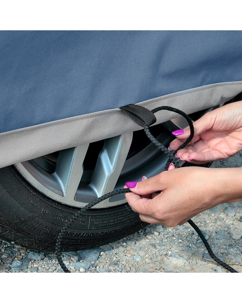 Die Plane passt sich elastisch an die Form des Fahrzeugs an. Sie wird mittels eines herkömmlichen Kordelzugs rund um das Fahrzeug solide befestigt und besteht aus einem festen und auf der Innenseite weichen Material. So kann das Produkt auch bei starkem Wind genutzt werden. Leicht anzubringen und zu entfernen.