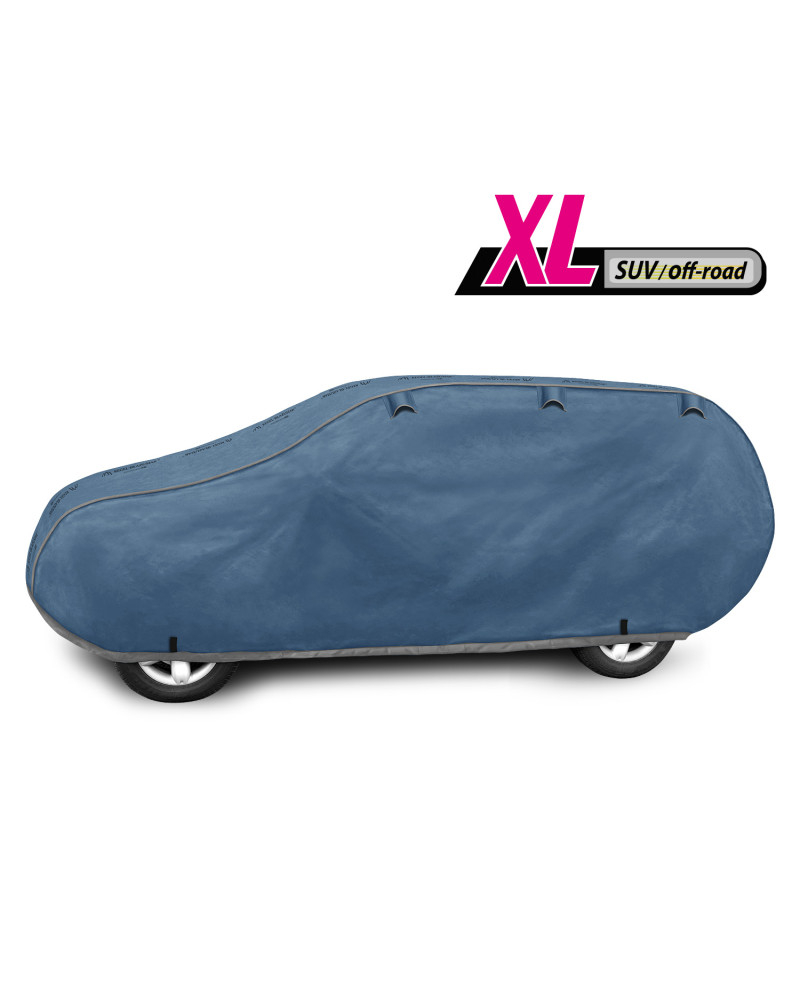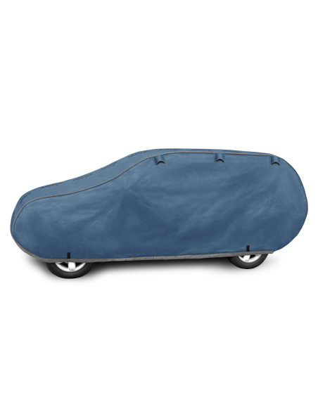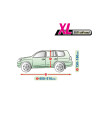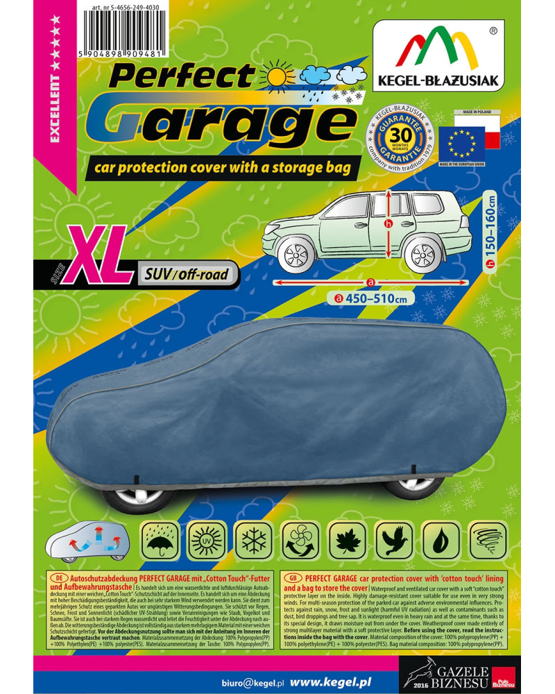 Ganzjährige Membranschutzplane für das Auto mit weichem Innenfutter und witterungsbeständiger Oberfläche. Vollständig aus vierschichtigem Material mit wasserabweisender, dampfdurchlässiger Membran gefertigt. Dadurch ist die Plane komplett wasserdicht, leitet aber den Wasserdampf von innen ab. Ein mit der Perfect Garage abgedeckter PKW bleibt bei Regen trocken, wobei der Wasserdampf durch die Membran verdampft und das Fahrzeug so gegen Korrosion geschützt wird. Darüber hinaus schützt die Stoffgarage gegen Rostflecken, Ausbleichen und Glanzverlust von Lack und Chromteilen. Schützt zudem gegen Regen (auch sauren Regen), Sonne (UV-Strahlung), Staub, Vogelausscheidungen, Blätter, Baumharz, Schnee und Rauhreif. Die weiche Polsterung der Plane verhindert die meisten Kratzer und Lackabschürfungen.