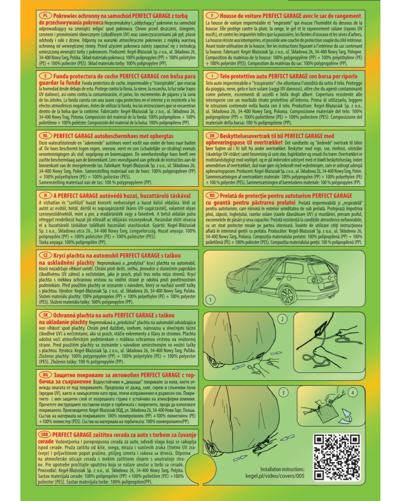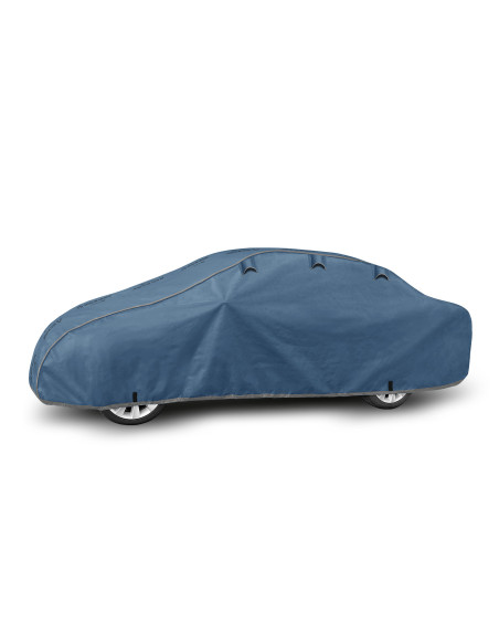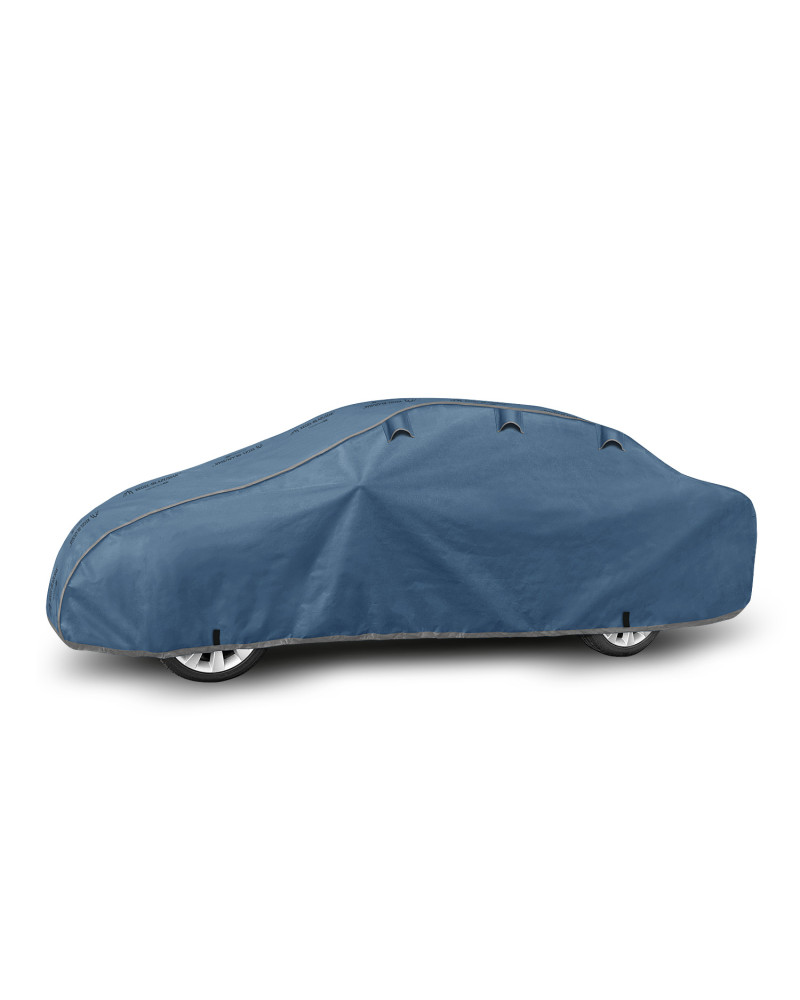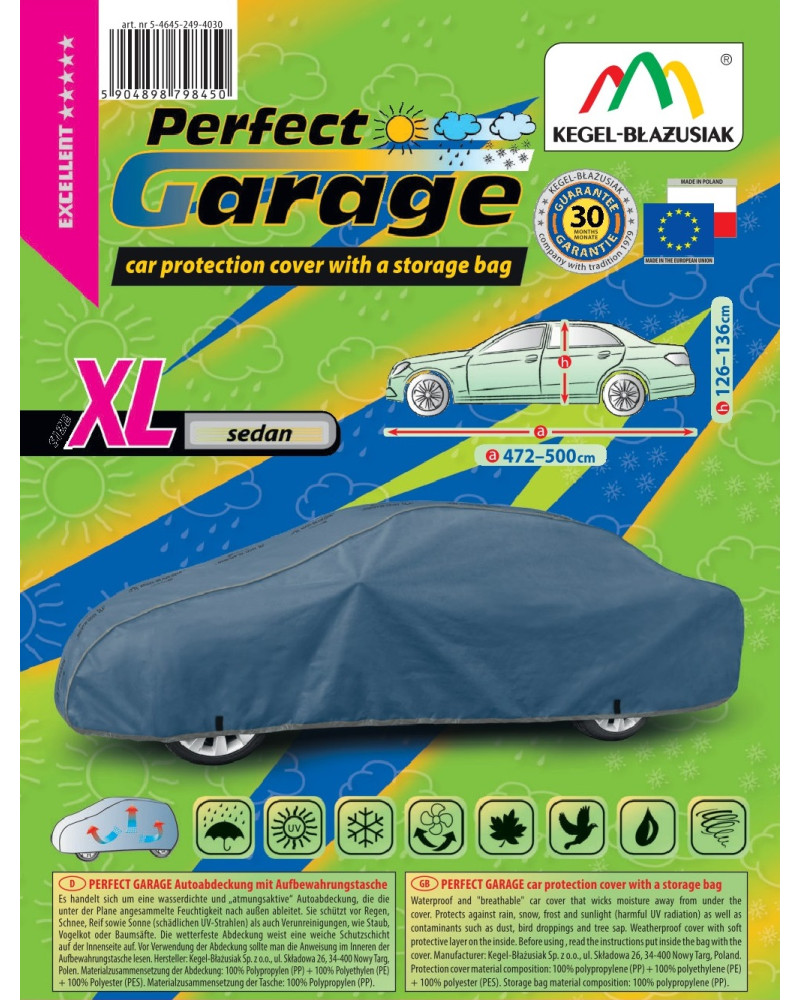 Ganzjährige Membranschutzplane für das Auto mit weichem Innenfutter und witterungsbeständiger Oberfläche. Vollständig aus vierschichtigem Material mit wasserabweisender, dampfdurchlässiger Membran gefertigt. Dadurch ist die Plane komplett wasserdicht, leitet aber den Wasserdampf von innen ab. Ein mit der Perfect Garage abgedeckter PKW bleibt bei Regen trocken, wobei der Wasserdampf durch die Membran verdampft und das Fahrzeug so gegen Korrosion geschützt wird. Darüber hinaus schützt die Stoffgarage gegen Rostflecken, Ausbleichen und Glanzverlust von Lack und Chromteilen. Schützt zudem gegen Regen (auch sauren Regen), Sonne (UV-Strahlung), Staub, Vogelausscheidungen, Blätter, Baumharz, Schnee und Rauhreif. Die weiche Polsterung der Plane verhindert die meisten Kratzer und Lackabschürfungen.