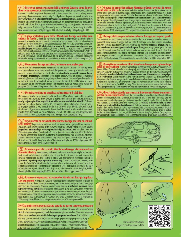 Wasserdichte und gleichzeitig dampfdurchlässige Membranautoabdeckung. Sie ist auch bei starkem Regen wasserdicht und zugleich dampfdurchlässig, so dass die Feuchtigkeit unter der Abdeckung abtransportiert wird. Wetterfeste Abdeckung, die vollständig aus einer hochgradig dampfdurchlässigen Membran besteht. Sie schützt vor Regen, Schnee, Frost und Sonnenlicht (schädlicher UV-Strahlung) sowie Verunreinigungen wie Staub, Vogelkot und Baumsäfte.