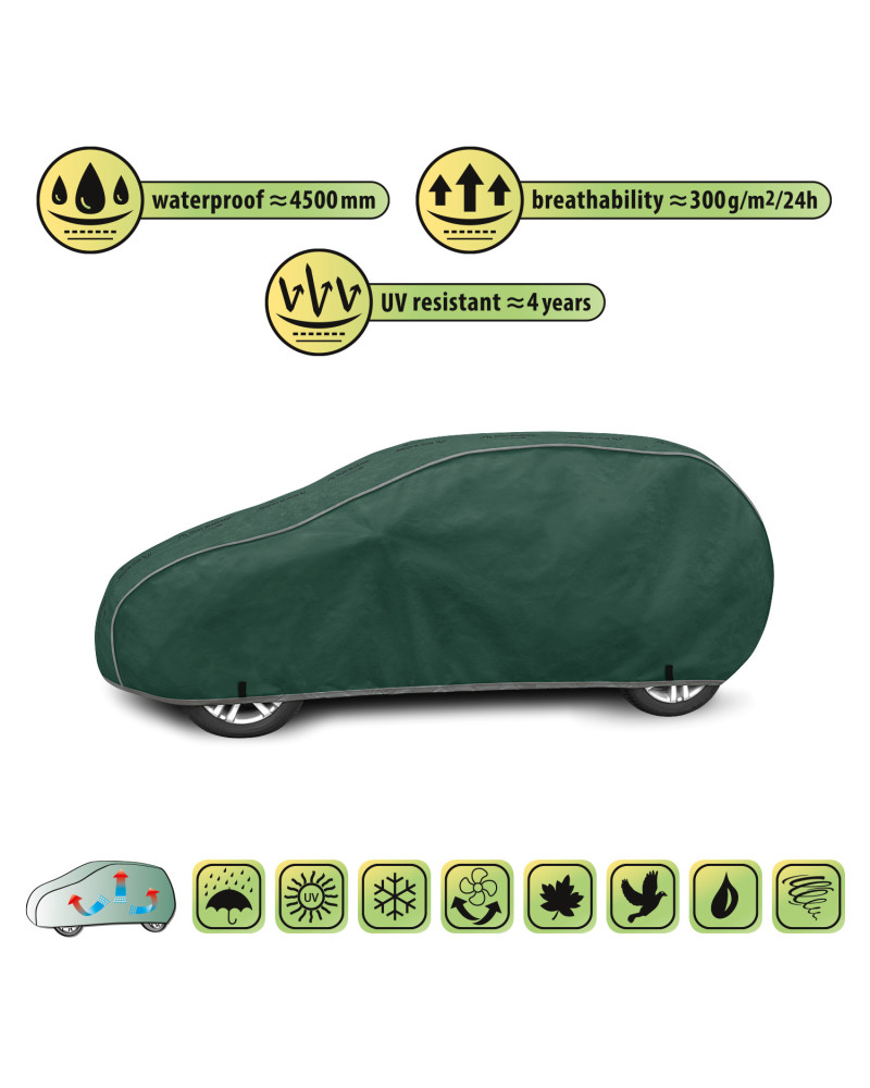 Wasserdichte und gleichzeitig dampfdurchlässige Membranautoabdeckung. Sie ist auch bei starkem Regen wasserdicht und zugleich dampfdurchlässig, so dass die Feuchtigkeit unter der Abdeckung abtransportiert wird. Wetterfeste Abdeckung, die vollständig aus einer hochgradig dampfdurchlässigen Membran besteht. Sie schützt vor Regen, Schnee, Frost und Sonnenlicht (schädlicher UV-Strahlung) sowie Verunreinigungen wie Staub, Vogelkot und Baumsäfte.