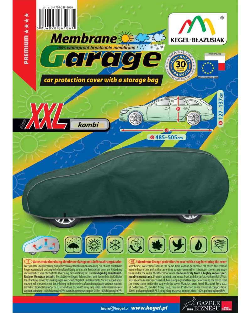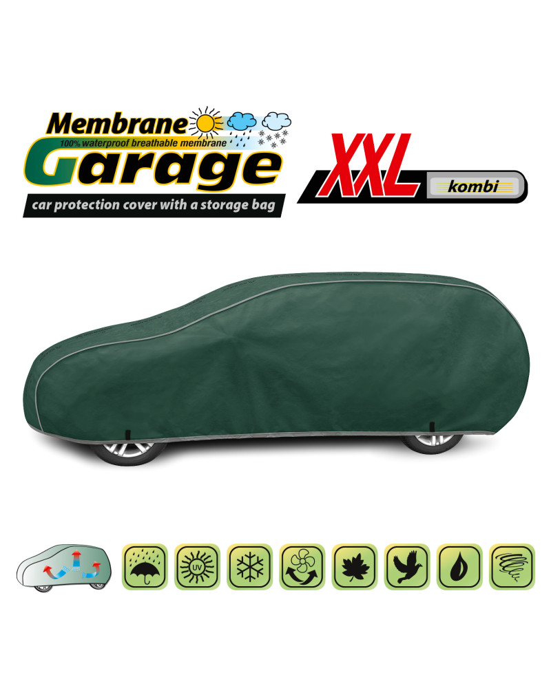Wasserdichte und gleichzeitig dampfdurchlässige Membranautoabdeckung. Sie ist auch bei starkem Regen wasserdicht und zugleich dampfdurchlässig, so dass die Feuchtigkeit unter der Abdeckung abtransportiert wird. Wetterfeste Abdeckung, die vollständig aus einer hochgradig dampfdurchlässigen Membran besteht. Sie schützt vor Regen, Schnee, Frost und Sonnenlicht (schädlicher UV-Strahlung) sowie Verunreinigungen wie Staub, Vogelkot und Baumsäfte.