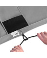 Vor dem Aufziehen der Abdeckung auf den Wagen sind die Spiegel anzuklappen bzw. die Antenne abzuschrauben Die Abdeckung ist auf einen sauberen und trockenen Wagen mit dem Aufdruck nach außen zu ziehen. Um die korrekte Positionierung der Abdeckung auf dem Auto zu erleichtern, sind auf der Vorderseite der Abdeckung das FRONT-Etikett und auf der Rückseite der Abdeckung das REAR-Etikett eingenäht (die Markierungen stimmen mit der Vorder- und Rückseite des Autos überein). Die unteren Abdeckungsabziehleine sind festzuziehen und zu schnüren. Dabei ist darauf zu achten, dass die Abzieherseile vor dem Festziehen gekreuzt werden und so den ersten Knoten bilden. Danach hat man die Seile fest zusammenzuziehen und dabei die Kräfte parallel zur Fahrzeughinterkante zu richten (siehe Abbildung 2). Die Abzieherseile sind zuzubinden und es ist zu prüfen, ob sich der Knoten nach dem Ziehen des Abziehers nicht löst. Löst sich der Knoten, so ist der Vorgang zu wiederholen und die Bindemethode zu ändern.