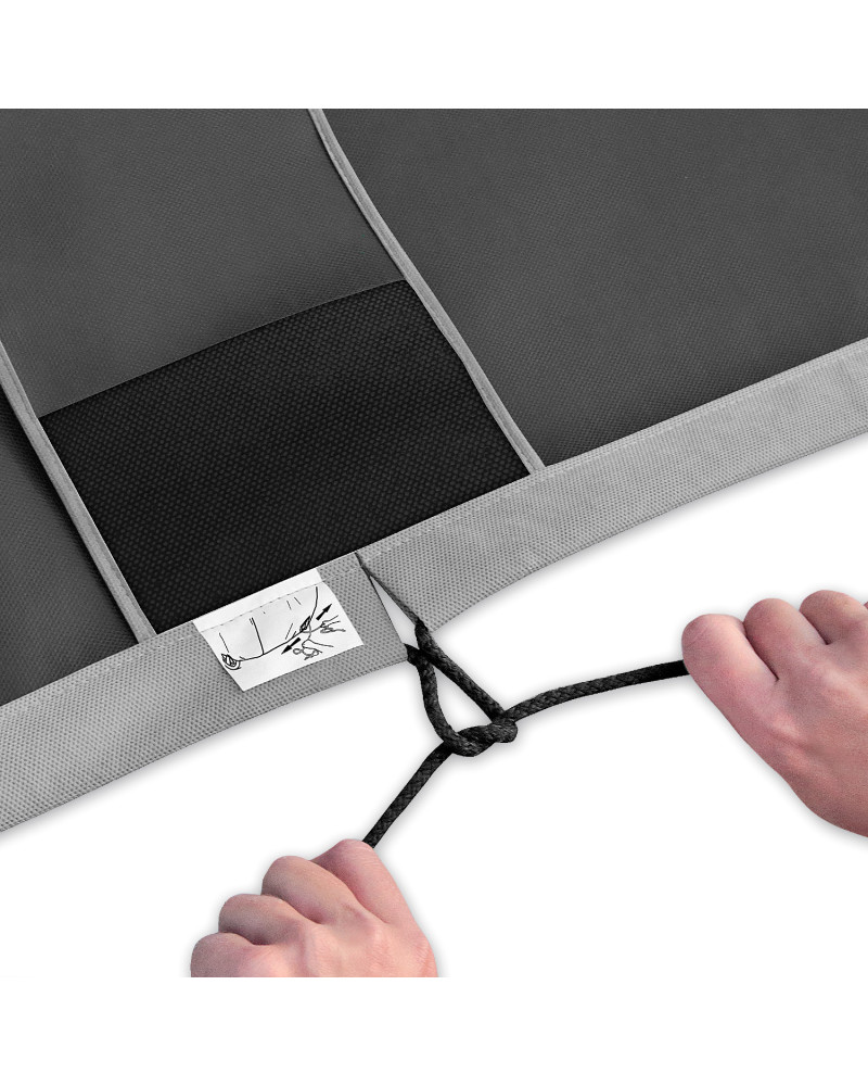 Vor dem Aufziehen der Abdeckung auf den Wagen sind die Spiegel anzuklappen bzw. die Antenne abzuschrauben Die Abdeckung ist auf einen sauberen und trockenen Wagen mit dem Aufdruck nach außen zu ziehen. Um die korrekte Positionierung der Abdeckung auf dem Auto zu erleichtern, sind auf der Vorderseite der Abdeckung das FRONT-Etikett und auf der Rückseite der Abdeckung das REAR-Etikett eingenäht (die Markierungen stimmen mit der Vorder- und Rückseite des Autos überein). Die unteren Abdeckungsabziehleine sind festzuziehen und zu schnüren. Dabei ist darauf zu achten, dass die Abzieherseile vor dem Festziehen gekreuzt werden und so den ersten Knoten bilden. Danach hat man die Seile fest zusammenzuziehen und dabei die Kräfte parallel zur Fahrzeughinterkante zu richten (siehe Abbildung 2 auf dem äußerem Etikett). Die Abzieherseile sind zuzubinden und es ist zu prüfen, ob sich der Knoten nach dem Ziehen des Abziehers nicht löst. Löst sich der Knoten, so ist der Vorgang zu wiederholen und die Bindemethode zu ändern. Fädeln Sie die zusätzlichen Leinen durch die Schlaufen, die am unteren Rand der Abdeckung neben den Fahrzeugrädern eingenäht sind, und befestigen Sie die Abdeckung an den Fahrzeugfelgen (nicht an den Radkappen).