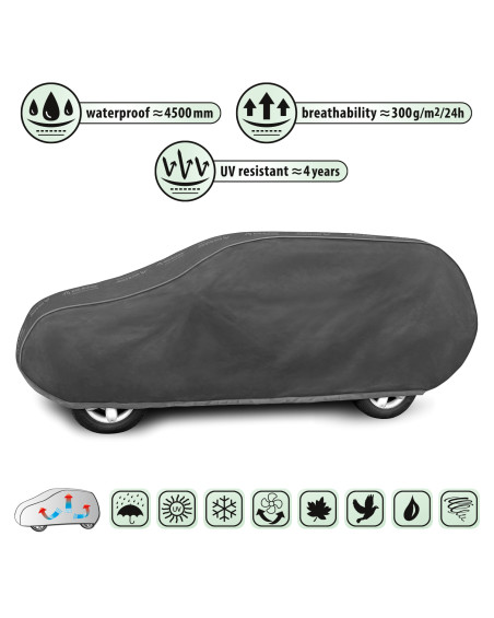 Wasserdichte und gleichzeitig dampfdurchlässige Membranautoabdeckung. Sie ist auch bei starkem Regen wasserdicht und zugleich dampfdurchlässig, so dass die Feuchtigkeit unter der Abdeckung abtransportiert wird. Wetterfeste Abdeckung, die vollständig aus einer hochgradig dampfdurchlässigen Membran besteht. Sie schützt vor Regen, Schnee, Frost und Sonnenlicht (schädlicher UV-Strahlung) sowie Verunreinigungen wie Staub, Vogelkot und Baumsäfte.