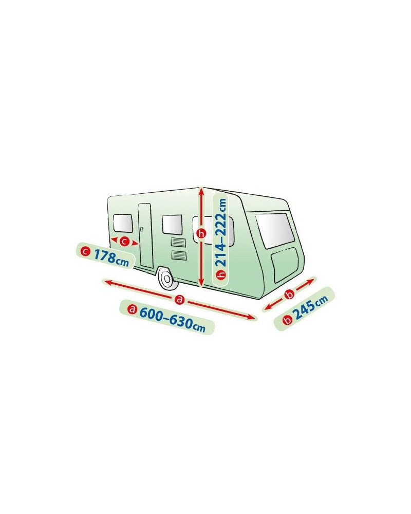 Die Hülle ist mit einer mit Reißverschlüssen verschließbaren Klappe ausgestattet, die das Öffnen der Wohnwagentür ohne Notwendigkeit des Hüllenabzugs ermöglicht. Sie schützt vor Lochfraß sowie vor dem Verblassen als auch dem Mattwerden von Lack und Chromelementen. Sie schützt auch vor meisten Rissen und vor Korrosion. Außerdem schützt sie vor Regenschauern (auch saurem Regen), Sonnenstrahlen (UV-Strahlung), Staub, Vogelexkrementen, Baumblättern und -säften, Schnee und Frost. Die Hülle ist gut angepasst, wird sicher mit Schnallen verschlossen und ist aus einem starken und einseitig glatten Material gefertigt. Dadurch kann sie auch bei starkem Wind verwendet werden. 30-monatige Garantie.