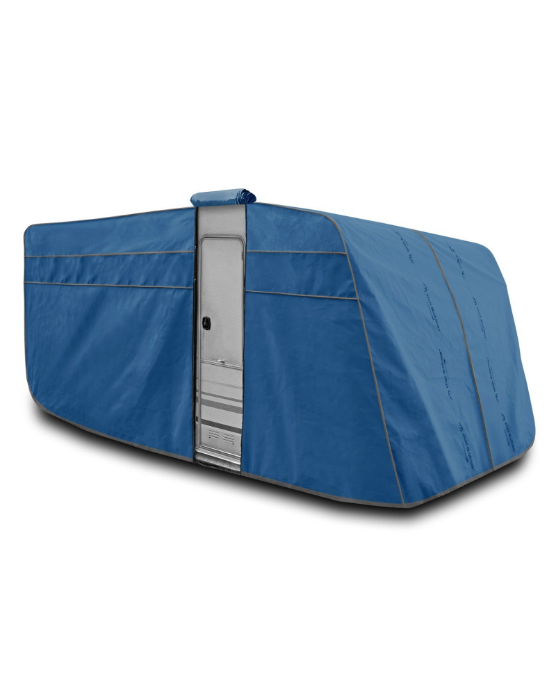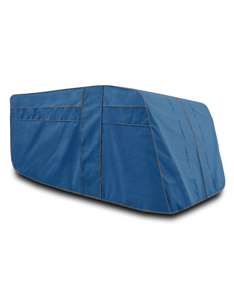 Wasserfeste ganzjährige Schutzhülle für den Wohnwagen, die die Feuchte von der Hüllenunterseite abführt. Sie dient zum ganzjährigen Schutz des geparkten Wohnwagens vor ungünstigen Witterungseinflüssen. Die Hülle ist leicht auf- und abziehbar. Dank einer speziellen Konstruktion und der Ausführung aus einem dreischichtigen dichten dampfdurchlässigen und schwer wasserdurchlässigen Material bleibt die Schutzhülle während eines Regenschauers total dicht und führt bei einer Umgebungstemperatur über den Nullgrad die sich unter der Hülle sammelnde Feuchte nach außen.